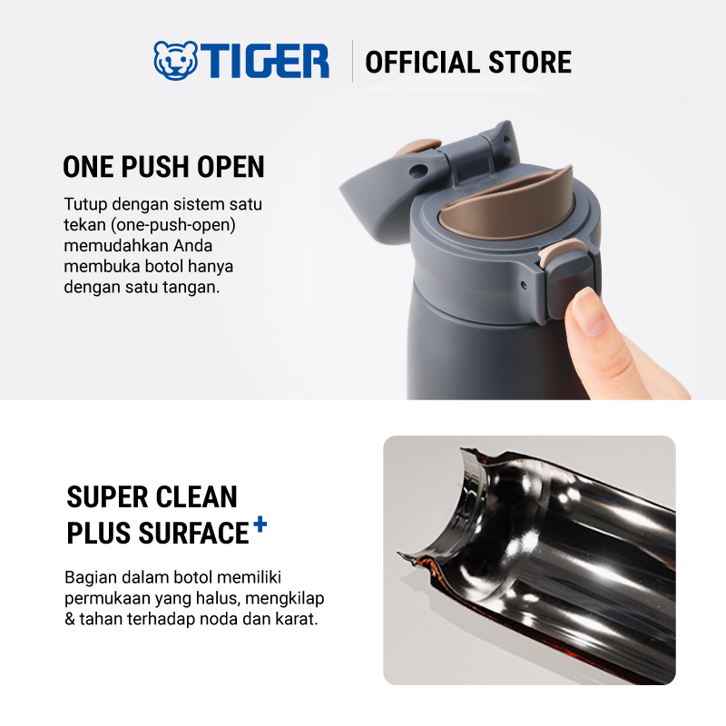 Botol dengan tutup tombol tekan yang dirancang untuk kemudahan pembersihan dan kenyamanan minum terbaik, dilengkapi dengan nilai sertifikasi teknis Manusia untuk pengalaman minum yang terbaik sepanjang sejarah Tiger.